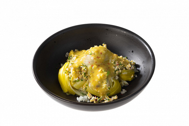 Точно по такому рецепту — с соусом и вареным яйцом — в Англии часто готовят зеленую спаржу. Но спаржи зимой не найти, и Джейми Оливер остроумно заменяет ее всесезонным пореем, который на вкус еще интереснее — есть в нем сладость и кремовость с легкой кислинкой, как будто варили его не в воде, а в сливках. Подается нежный порей с почти что новогодней «Мимозой» — сваренными вкрутую и измельченными яйцами. Нежная яичная крошка усиливает сливочность порея и уравновешивает кислотность винегрета.