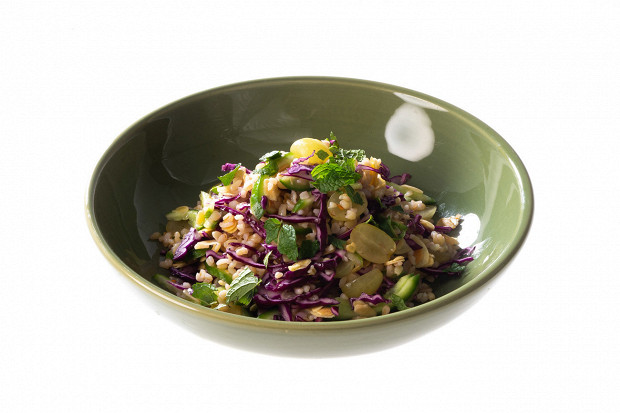Булгур — крупа из термически обработанной и дробленой пшеницы с призрачным, чуть сладковатым вкусом. Салаты с булгуром давно прижились на кухне, поскольку он с радостью впитывает все поселившиеся рядом вкусы. Джейми Оливер устраивает тюнинг булгуру при помощи свежего огурца, капусты и винограда, добавляющих сочности жестковатым зернышкам. А лепестки миндаля подчеркивают ореховую ноту, присущую крупе самой по себе. Получается простое, но цветистое блюдо, которое подойдет в качестве гарнира к баранине. Либо как праздничная закуска для вегетарианцев.