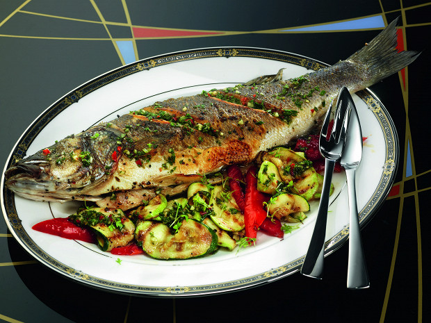 Сибас с овощами и песто из прованских трав