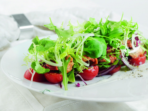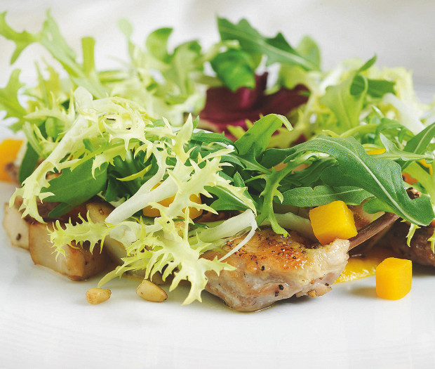 Перед тем как выложить на цыпленка салатную смесь, ее хорошо бы сбрызнуть оливковым маслом.