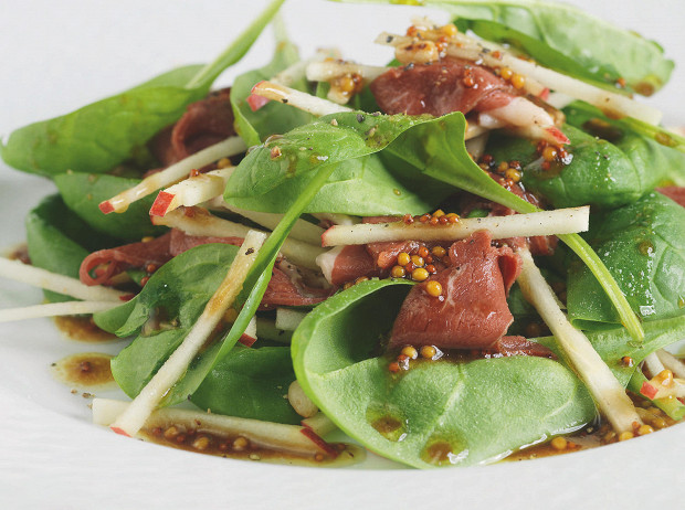 Салат с копченой утиной грудкой, шпинатом и яблоками