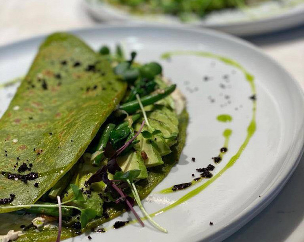Нутовый креп с зелеными овощами, сальсой, сметаной из кешью и вялеными томатами