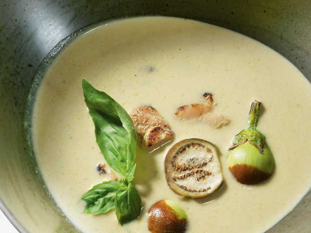 Тайские баклажаны — зеленовато-белесые шарики размером со сливу. По вкусу они не сильно отличаются от привычных нам фиолетовых, тем более что в карри их мякоть все равно хорошо пропитывается соусом, но смотрятся, конечно, намного эффектнее. Баклажаны в зеленом карри лучше есть немедля: дольше они пролежат в соусе — мягче и темнее будут.