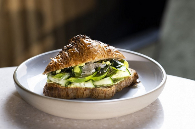 Игра в модный большой зеленый салат — в круассан упаковываются авокадо, водоросли, огурец и бобы эдамамэ. Никаких заправок этой полезной компании не надо, но при желании можно сбрызнуть все лимоном.