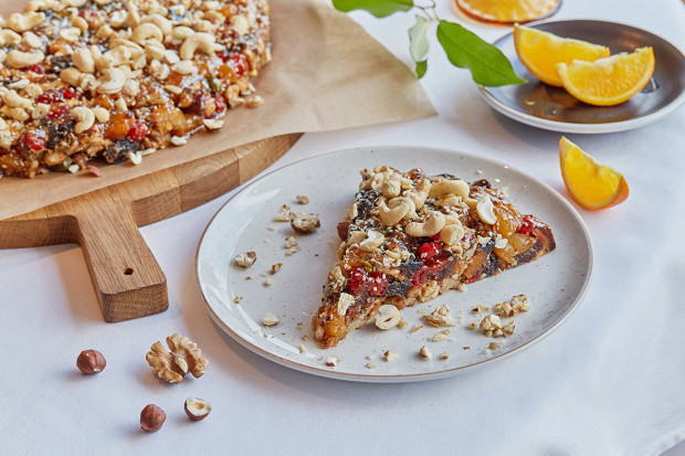 По форме — пирог, по сути — плотная и тяжелая масса из орехов и сухофруктов. Сцепкой служит сгущенный апельсиновый сок и немного муки — всего 150 грамм на 10 порций этого пирога. Это настоящий концентрат калорий, способный поднять уровень энергии за считаные минуты. Рецепт Марии Новосой из ресторана «Магадан».