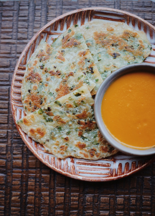 Для лепешек нужна пшеничная мука — довольно сильная, с достаточным содержанием глютена. Замесите тесто из муки, воды и соли, оставьте его отдыхать примерно на час-полтора. Затем сформируйте лепешки, раскатайте их в тоненькие блинчики. Дальше идет важный момент: посыпьте тесто зеленым луком и кунжутом, сверните каждый блинчик в трубочку, а затем сверните рулон в спираль. Оставьте тесто в таком виде отдыхать минут на 20–30 — это нужно для того, чтобы тесто еще раз расстоялось. После чего лепешки еще раз раскатайте, смажьте топленым маслом и обжарьте на сковороде (ну или как мы, на тэппане).