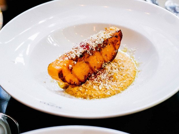 «Тыква хорошо дружит с яркими специями, такими как корица, мускатный орех или имбирь. Но в супе, конечно, ее главная роль — тело, на которое нанизываются все возможные ароматы и привкусы. А чтобы сама тыквенная база была более выпуклой, тыкву мы запекаем вместе с кожей и семенами, приправив тимьяном и медом, запаковав тыкву в фольгу, а уж потом очищаем от лишнего, так база для супа получается гораздо ароматнее».