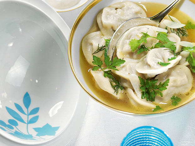 Подавать эти пельмени лучше в глубокой пиале с крышкой, чтобы они еще немного потомились в бульоне.