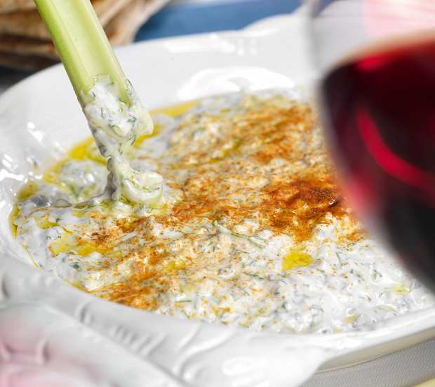 «Главная греческая закуска, которая здорово сочетается с водкой и которую очень просто готовить. Тут все логично — кисломолочное всегда идет водке, да и после нее тоже очень хорошо. Соус дзадзики и вовсе похож на облегченный вариант окрошки, а еще в него можно макать обжаренный язык из предыдущего рецепта».