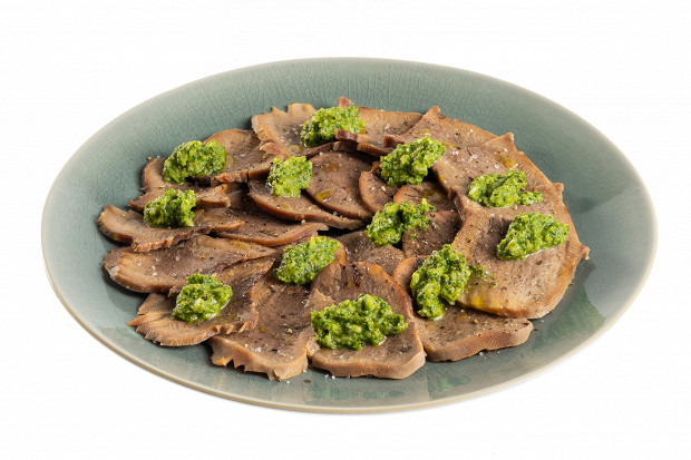«Классическая водочная закуска, чуть столовская, но переиначенная. Можно просто подать язык вареным, как это указано в рецепте, а можно — и я советую именно так и сделать - разрезать готовый язык и слегка обжарить на топленом масле и подать теплым, что усилит языковый характер и что будет куда вкуснее. К языку полагается что-то вроде соуса, и его роль тут играет зеленая сальса, в составе которой есть много чего — от руколы и корнишонов до анчоусов. Все вместе — опять же, жирная протеиновая еда, которая является водке лучшим товарищем».