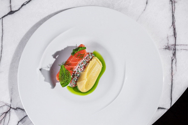 Подкопченный лосось с картофельным пюре и соусом из простокваши
