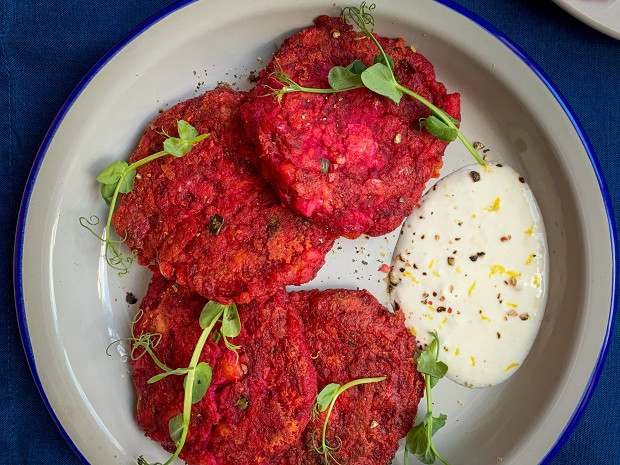 Оладьи из красной рыбы и свеклы с йогуртом и хреном