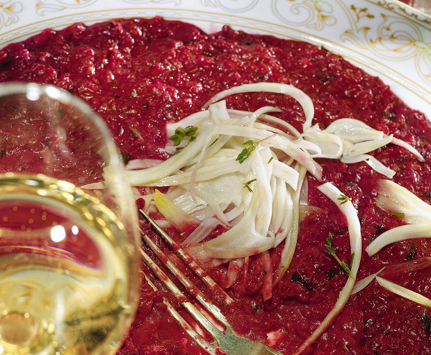 Полба, как и любая крупа, отлично впитывает в себя цвет и все вкусовые оттенки соседствующих с ней ингредиентов. В этом рецепте ей помогает насытиться цветом не только свекла, но и интенсивный свекольный сок. Вкус же блюда формирует целый букет ингредиентов, где есть и херес, и чеснок, и другие радости.