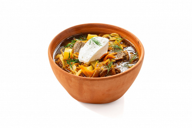 Самый популярный народный рецепт. Грибы сначала обжариваются в сливочном масле до золотистого цвета, а потом соединяются с такой же луково-морковной зажаркой. Грибы любят сливочность, поэтому добрая ложка жирной сметаны этот замечательный суп только украсит. Вкуснее всего, конечно, он получается из свежих лесных грибов, но и с сушеными тоже неплохо — они отдают супу душистость, а плотность можно получить и из всесезонных шампиньонов.