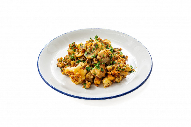 Цветная капуста — овощ-хамелеон. В ресторанах она сегодня играет самые разные роли: и теста для пиццы, и «риса» для суши, даже чизкейк в одном модном московском ресторане делают в форме капустного кочана. В этом рецепте все, конечно, проще. Слегка отваренные и обжаренные в кляре капустные соцветья смешиваются с жареными шампиньонами и резонируют с грибным вкусом. А грецкие орехи, интересный горчичный соус и свежая зелень делают этот немудреный салат запоминающимся.