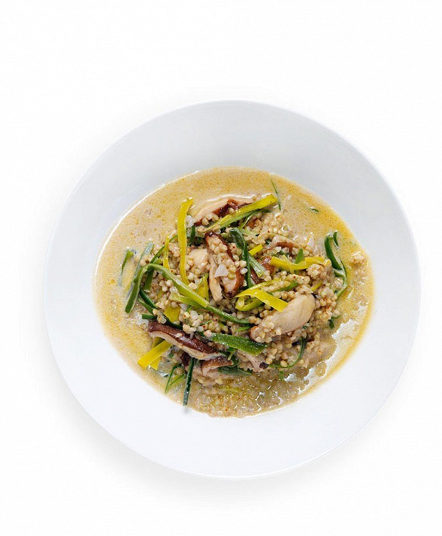 Современная версия гречневой каши с грибами. В зеленой гречке больше травянистости, чем ореховых нот, жареный порей придает ей не остроту, а пикантную сладость, а сливочный сыр — мягкость и обтекаемую плавность всему кулинарному сюжету. В общем, в этих обновках и парадоксальных сочетаниях вы старую добрую кашу даже не узнаете.
