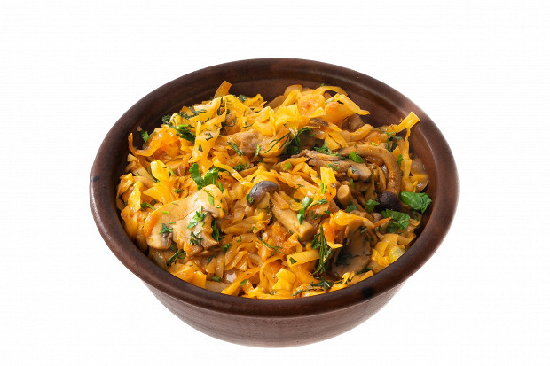 Грибы тушеной капусте очень к лицу. Лесной белок сглаживает тяжелый простонародный капустный дух и, что самое главное, делает из гарнира полноценное блюдо. Грибы можно брать любые — сушеные лесные, вешенки, шампиньоны, даже удивительные в русской солянке азиатские шиитаке — с любыми грибами капуста не будет выглядеть скучной.