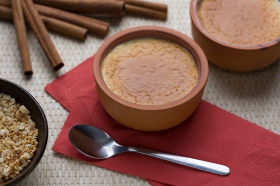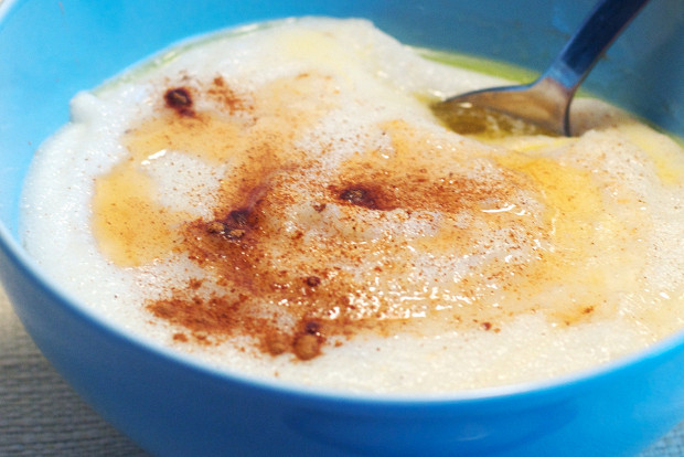 Коровье молоко заменяется кокосовым, вкус которого усиливают цедра и имбирь. Техника приготовления неизменна — всыпать крупу в кипящее молоко и стремительно размешивать.