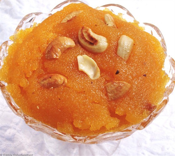 Манная каша варится на кокосовом молоке, но вкус его — только фон для ярких оттенков кардамона, корицы и жареного кешью. За янтарный цвет отвечает щепотка шафрана.