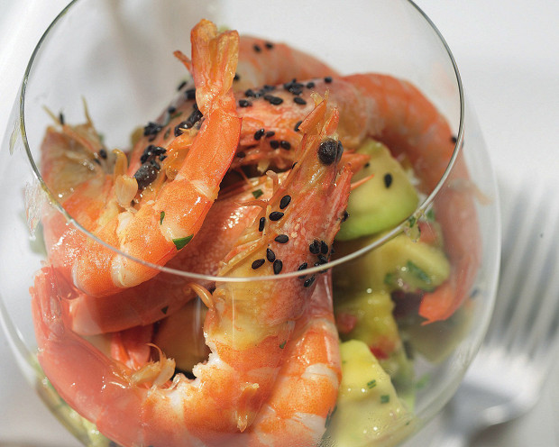 У этого рецепта две проблемы. Первая — нужно не переварить креветки, они должны остаться податливыми и сочными и не превратиться в резину. Вторая — найти очень спелое авокадо, чтобы буквально таяло под ножом. Нашли? Тогда пожените эту сладкую парочку при помощи имбирного соуса винегрет.