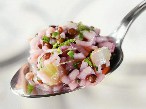 Увесистая закуска, в которой вареная чечевица разбавлена свежими овощами и оливковым маслом. Рецепт из книги Мэри Маккартни «Food. Вегетарианская кухня для дома».