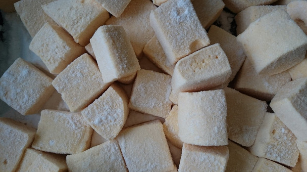 Проще некуда: облепиха превращается в ягодное пюре, смешивается с желатином, взбивается, остужается и режется кубиками. Все.