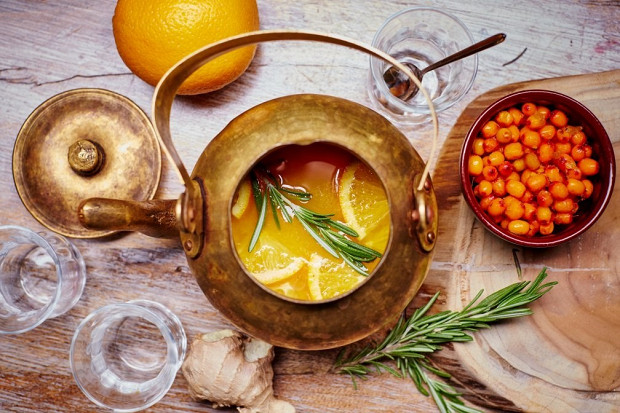Праздничный чай из облепихи, имбиря, апельсина, лимонного сока и розмарина. Долго кипятить чай не надо, иначе пострадают витамины. Придуманный Александром Каном безалкогольный коктейль, который подают в ресторанах True Cost.