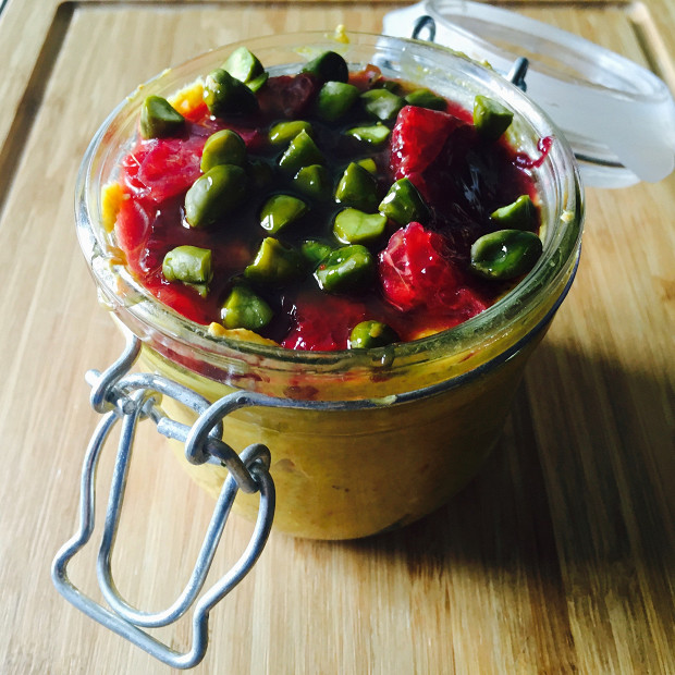 Облепиховый cыроедческий завтрак красными апельсинами и фисташками