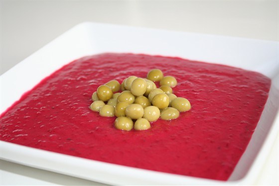 Компоненты винегрета, дополненные соленой семгой, превращаются с помощью блендера в гомогенную кашу. На стол подавать в глубокой тарелке, выложив в центре пюре горку из зеленого горошка. Есть ложкой.