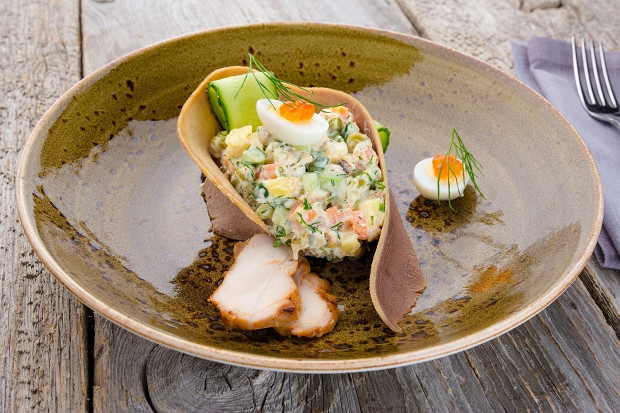 Нарядная горка, основа которой — язык, три вида грибов, помидоры и соленые огурцы. С огурцов советуют снять кожу. Рецепт из ресторана «Ваниль».