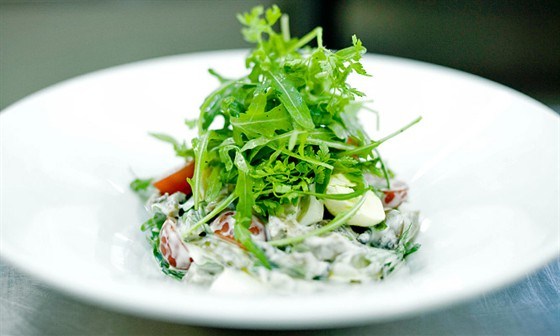 Помимо стандартных свеклы, картошки и моркови здесь руккола и анчоусы. Чтобы меньше возиться, можно воспользоваться набором овощей для винегрета «Белая Дача».