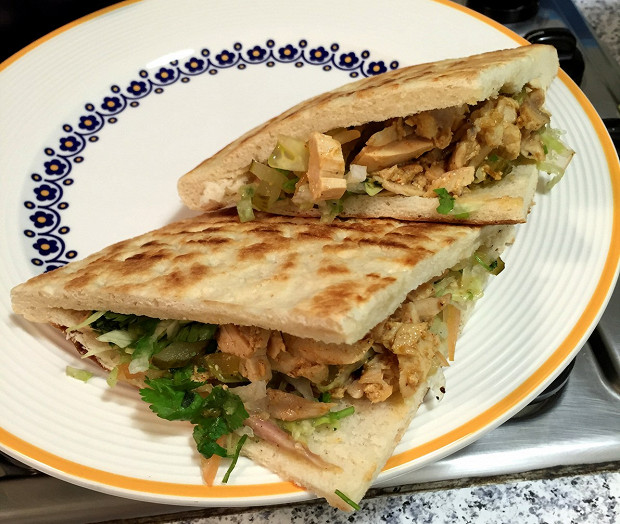 Разогретые на сковородке четвертинки питы начиняются сочной смесью из жареной курицы, йогурта, специй, петрушки и салатных листьев. Рецепт хорош тем, каждый ингредиент тут легко можно заменить на схожий, главное — сохранить баланс между мясом, соусом и овощами.