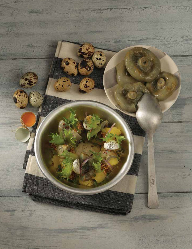 Грузди, соленые огурцы и перепелиные яйца выкладываются на горячий мятый картофель. Есть теплым. Рецепт из книги Максима Рыбакова «О чем мечтают мужчины».