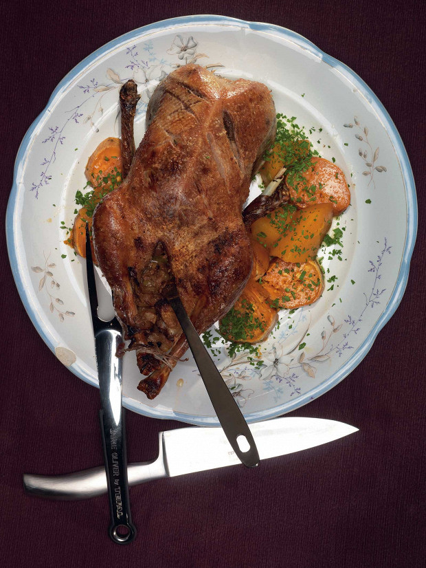 Гусь с яблоками — интернациональная классика. В этом случае яблоки нужно очень мелко порезать и смешать с бренди.