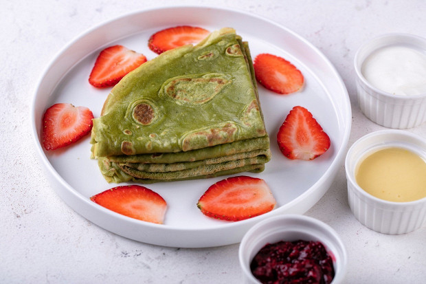 Матча не сильно повлияет на вкус блинов, зато придаст им удивительный оттенок. А если добавить еще чего-нибудь красного, например клубники, то блюдо сразу претендует на центр стола.