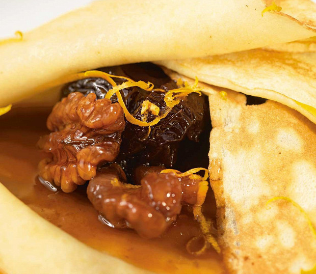 Пшеничные блинчики с соусом из чернослива, грецких орехов и апельсинового сока