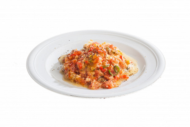 Турецкая яичница с помидорами. От израильской шакшуки ее отличает минимальный набор ингредиентов: всего-то и нужно, что пожарить помидоры с луком и залить овощи яйцом.