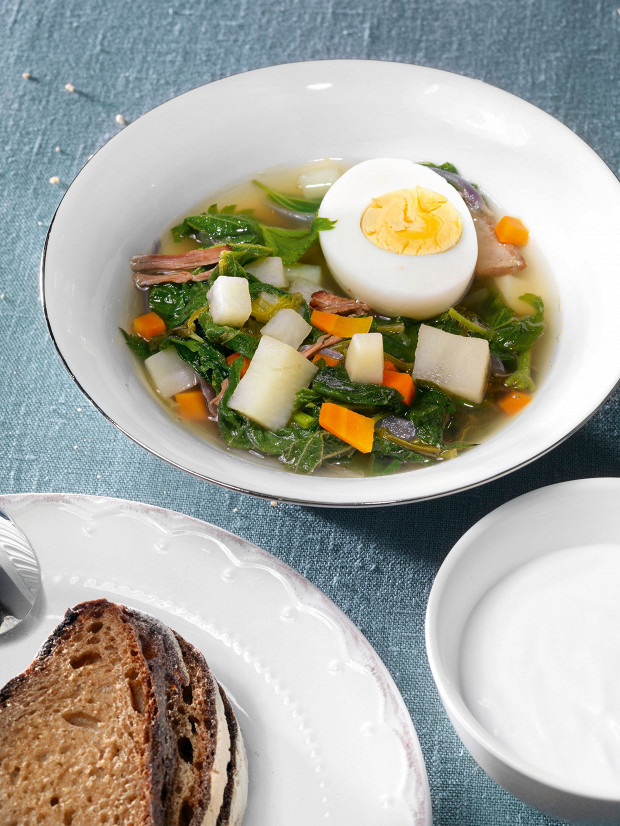 Классический летний суп, в котором густой бульон из говяжьей лопатки нейтрализуется свежим вкусом крапивы, щавеля и шпината.