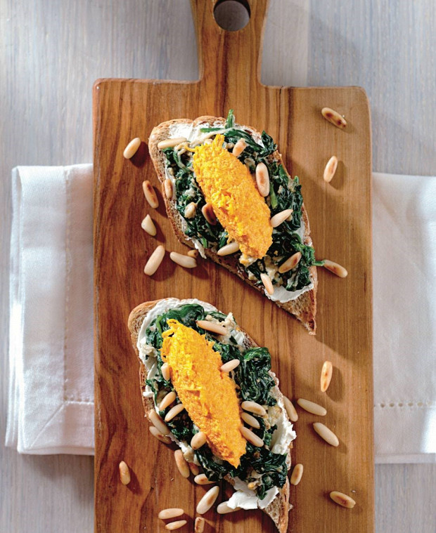 Бутерброд с щавелем, творожным сыром и морковным муссом