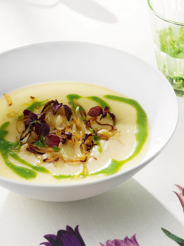 Нарядный суп-пюре, в котором щавель дополнен петрушкой, базиликом, кинзой, чесноком и луком — пореем и репчатым.