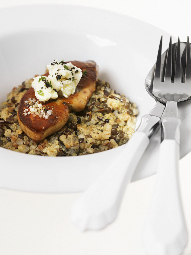 Гречка вступает в союз с диким рисом, киноа, чечевицей и перловкой, и это содружество скрепляется оливковым маслом и венчается фуа-гра. Обратите внимание: крупы надо варить по отдельности.