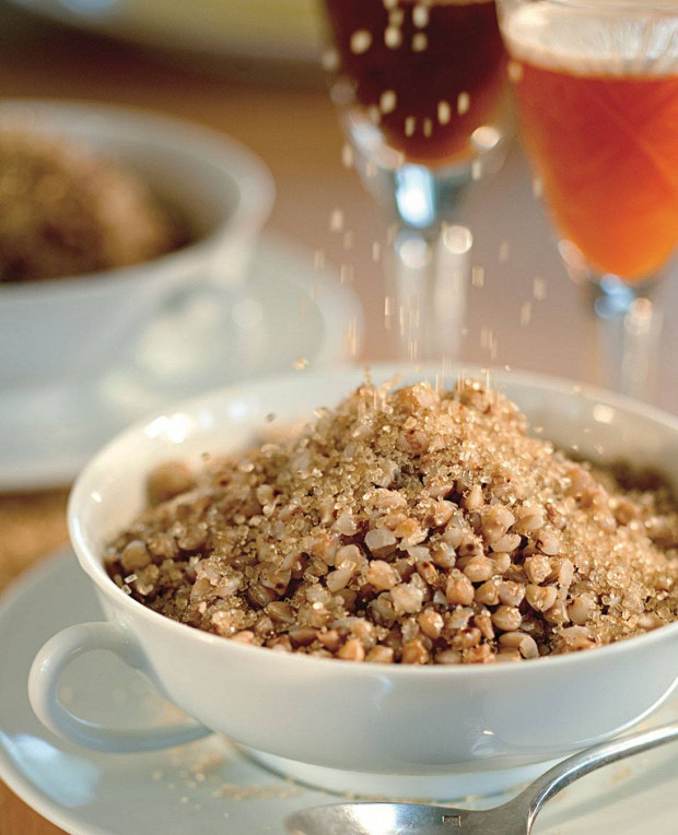 Рецепт из книги Алены Долецкой «Утро». Гречка варится традиционным дедовским способом, а потом подается с маслом из виноградных косточек и овощным соком.