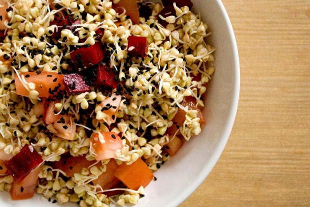 Зеленая гречка также замачивается на несколько часов — после чего она прорастает и становится мягкой. В рецепте прописаны соевый соус и соль, но вполне можно выбрать что-нибудь одно.