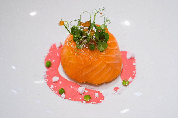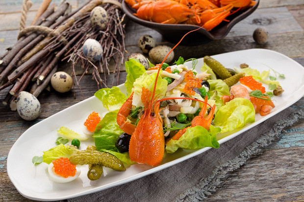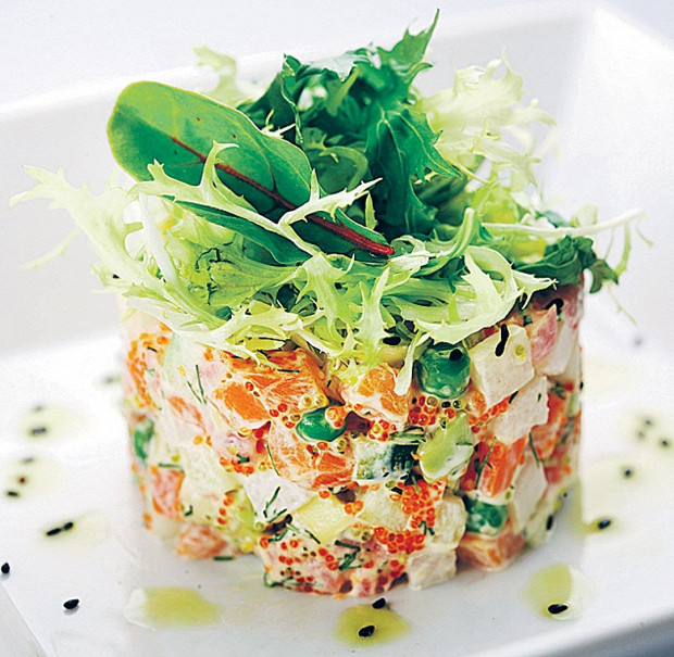 Более замысловатая версия рыбного оливье — шеф-повара московского ресторана «32.05» Владислава Рыбкина. Семга — копченая, крабы — отголосок раковых шеек «того самого оливье», а икра — чтобы жизнь удалась.