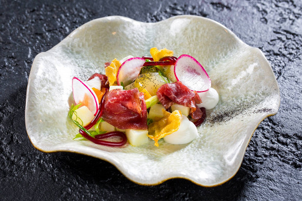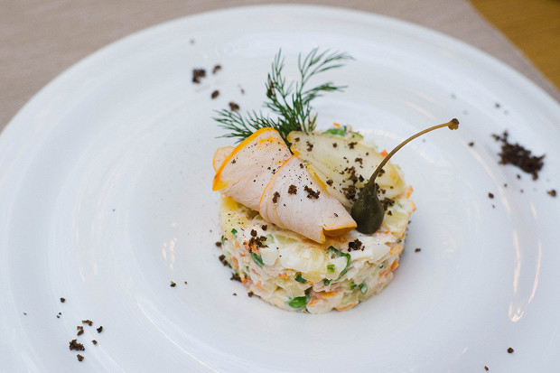 Оливье Адриана Кетгласа, бренд-шефа московских ресторанов AQ Kithen, AQ Chiken, Adri BBQ и Grand Cru. Главный ингредиент — сыровяленая оленина, а в качестве заправки вместо классического майонеза используют айоли.