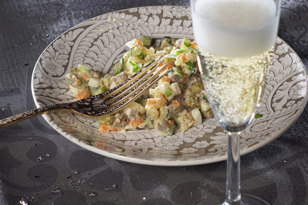 Елены Никифоровой — оливье в южнорусском и украинском духе. Соленые огурцы — домашние, не просто картошка, а запеченная с луком, в заправке не только домашний майонез, но и сметана. Яйца используются перепелиные, а из мясной начинки — язык и запеченная курица.