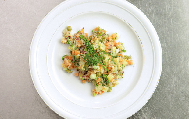 Этот оливье, рецептом которого с нами поделился бессменный шеф-повар «Кафе Пушкин» Андрей Махов, состоит из двух частей: первая — домашний оливье с куриной грудкой, а вторая — оливье,