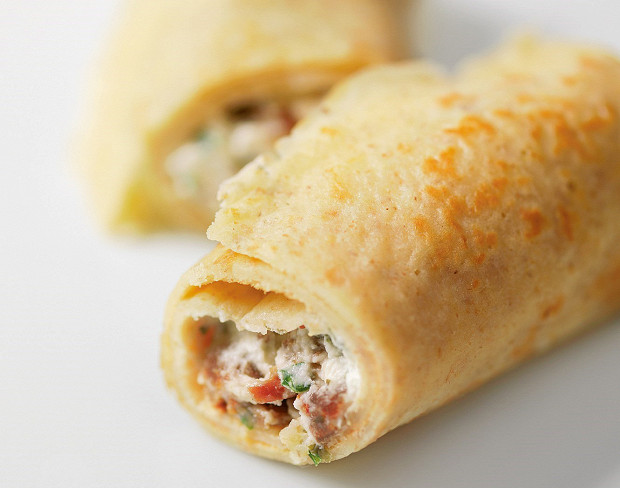 Блины получаются довольно тонкими и при этом эластичными. Весь секрет в том, что перед тем как попасть на сковороду, тесто должно хотя бы полчаса провести в холодильнике, чтобы клейковина муки начала работать и связала все ингредиенты. Завернуть блинчики можете любым способом, который вам нравится, хотите — треугольничками, хотите — рулетиками или трубочками. Они не порвутся, а на следующий день блины с начинкой можно будет разогреть на сковороде.