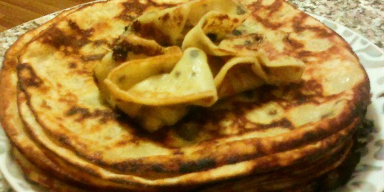 Большому блину рот радуется — очень верное замечание к этому рецепту. Из того же теста можно сделать отличные пухлые оладьи. А если хотите немного разнообразить рецепт, возьмите по половине пшеничной и гречневой муки. Ложку гречневой добавьте в опару, а остальную муку вмешайте при замесе теста.