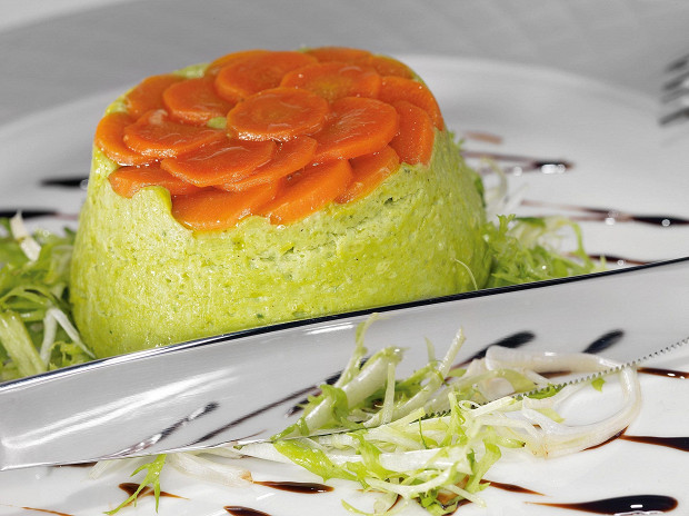 Нарядная кокетливая конструкция, больше напоминающая десерт. Пюре из брокколи соединяется с яйцами, яичными желтками и сливками и запекается в формочках вместе с морковными дольками.